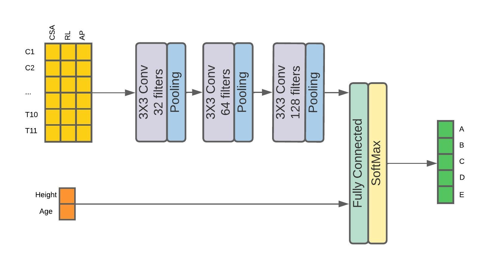 A custom convolutional neural network (CNN) was designed to learn from structural metrics across all spinal levels.